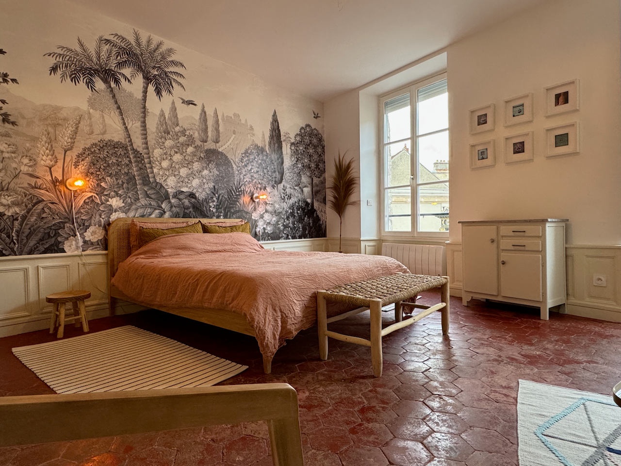 - Au 1er étage, Odilon allie le charme des hauts plafonds et lambris peints à l'ancienne, avec une décoration Bohémienne évoquant le voyage et l'artisanat.